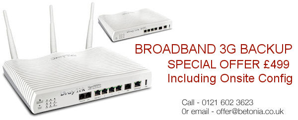 In the last few weeks UK Business have experienced major failures from BT Broadband and Blackberry services. This highlights the need to ensure your systems are redundant. So for this month special offer we are offering to supply install and configure to your network (subject to a few conditions) a Router/Firewall which will work with both ADSL and Cable Broadband but also allows you to also have a 3G data dongle as a backup in case your broadband fails. If the broadband fails at least you will remain connected to your customers. We include a 3G dongle of your choice on either Vodafone, O2, 3 or T-Mobile Pay As You Go basis.